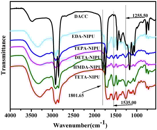 Figure 5 shows the FTIR spectra of different bio-NIPUs and DACC. Compared with the FTIR spectra of DACC, the bio-NIPU curves had some differences. The peak at 1801.65 cm−1 only existed in DACC because it is the carbonyl C=O stretching vibration from carbonic ester. As can be seen from Scheme 2, the cyclocarbonates were opened by the amine groups. Two new peaks appeared at 1535.00 and 1255.50 cm−1, which are the N–H stretching vibration and C–N stretching vibration, respectively, in bio-NIPU. The results confirm successful synthesis of bio-NIPU by DACC and different amines.