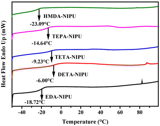 To study the thermal properties of different bio-NIPUs, the DSC curves are recorded in Figure 6. Glass transition temperature (Tg) values of the bio-NIPUs with secondary amines were higher than those of the bio-NIPUs with diamine. Tg value of DETA-NIPU was −6.00 °C, which was higher than the other NIPUs. The results suggest that secondary amines have a positive effect on the crystallization of bio-NIPU. These bio-NIPUs have low Tg values due to the soft segment long chain structure of dimer acid. There was only one single glass transition temperature for all bio-NIPUs, indicating good miscibility.