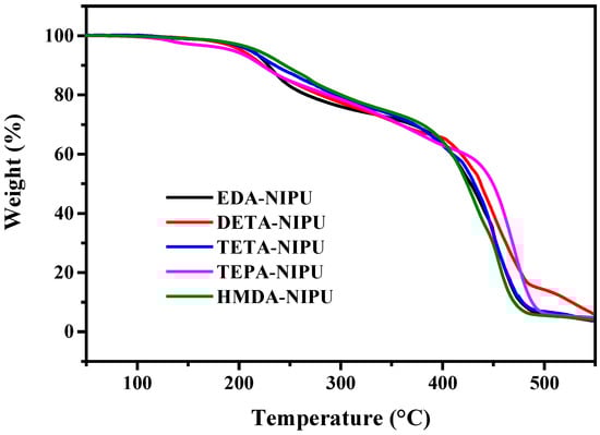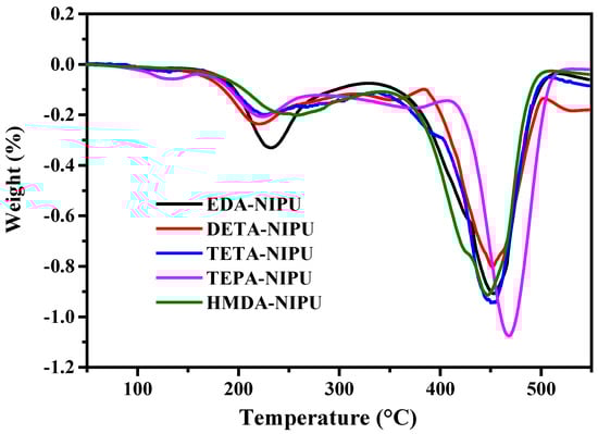 The influence of the average amine functionality was investigated for the thermal stability of the synthesized polymers via thermogravimetric analysis (TGA). Figure 7 and Figure 8 present TGA and differential thermal gravity (DTG) curves for different bio-NIPUs, respectively. The thermal stability of the EDA-NIPU, DETA-NIPU, TETA-NIPU, and HMDA-NIPU were similar with Td5% (the temperature at 5% weight loss) around 210 °C. The thermal stability value of TEPA-NIPU was lower with a Td5% equal to 194 °C (Table 1). The char contents at 550 °C are also shown in Table 1. These results suggest that secondary amines have no contribution to bio-NIPU synthesis. Thermal degradation of different bio-NIPUs takes place in two stages, corresponding to the hard and soft segments, because of thermodynamic incompatibility of the two segments in the bio-NIPU matrix. The temperatures for the maximum rate of degradation (Tmax) for each of the two stages for different bio-NIPUs are given in Figure 8 and Table 1. The Tmax1 values of DETA-NIPU, TETA-NIPU, and TEPA-NIPU were about 220 °C. However, Tmax1 values of EDA-NIPU and HMDA-NIPU were higher due to no reaction between the secondary amines and cyclocarbonates. The Tmax2 value of TEPA-NIPU was 468 °C, which was the highest temperature in the different bio-NIPUs. This result is due to the high boiling point of TEPA, which may influence the maximum rate of degradation of the soft segments.