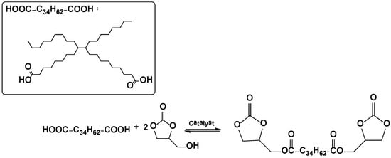 Dimer acids (DAs), produced by a Diels–Alder reaction of unsaturated fatty acids from unsaturated oil, are highly value-added industrial products and are widely used in different fields, such as adhesives, preservatives, plastic additives, and lubricants [7,8,9]. On the other hand, glycerol can also be easily produced from forestry oil, or sometimes is a byproduct of forestry oil processing [10,11,12]. A downstream synthetic product of glycerol is glycerol carbonate (GC), which also has many different industrial applications, such as coatings, surfactants, cosmetics, lubricants, and so on. Its structure contains a 2-oxo-1,3-dioxolane group and a hydroxyl group, which have high reaction activity with anhydrides, acyl chlorides, isocyanates, and the like [13,14,15]. Having a bio-based origin and wide reactivity, GC has become a versatile and renewable building block for chemical synthesis. To obtain highly purified GC, different synthesis methods have been investigated, including direct synthetic routes and indirect synthetic routes [16,17]. They all aim at the lowest production cost, the least pollution, and the highest yield of GC.