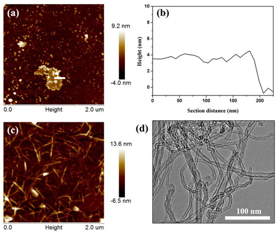 (a) Atomic force microscope (AFM) image, and (b) height profile image of the graphene nanosheet; (c) AFM image of NFC; (d) transmission electron microscope (TEM) image of CNTs.