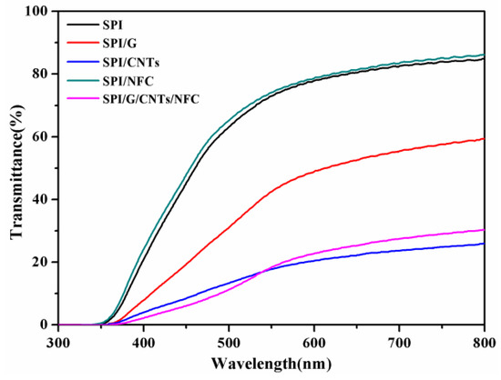 UV-vis spectroscopy was applied to study the effect of graphene, CNTs and NFC on the optical transmittance of different SPI-based films. As shown in Figure 5, the SPI/G film showed a lower transmittance than the control film, which was due to the absorption and light scattering of the graphene nanoplatelets. This result was consistent with the fact that graphene can partly absorb visible light [38]. The SPI/G/CNT/NFC nanocomposite film had a relatively low optical transmittance value, which could be explained that CNTs were dispersed uniformly and separately in the SPI matrix [39]. These results demonstrated that the SPI-based nanocomposite films containing the nanofillers of graphene, CNTs, and NFC, possessed superior barrier abilities for ultraviolet and visible light.