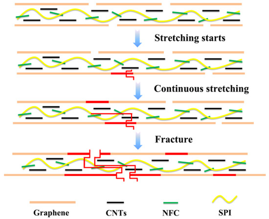 To understand the synergistic effect from graphene, CNTs, and NFC, a crack extension model was proposed, as shown in Figure 7. When the loading was gradually applied to SPI/G/CNT/NFC nanocomposite film, the hydrogen bonds were firstly destroyed, and relative slippage started to occur between the adjacent graphene nanosheets, initiating the crack propagation. The friction between graphene nanosheets and CNTs then led to the movement of the CNT along the graphene nanosheets. In addition, 1D nanofibrous NFC could act as extensional tentacles for the hybrid structures and was entangled with the polymer chains, which increased more friction between graphene and CNT nanosheets. The SPI chains interpenetrated into the interlayer and provided enough interactions between adjacent nanofillers. With further increasing deformation, the covalent bonds between NFC and SPI molecular chains were damaged, resulting in much more energy absorption. This cycling of initiation–propagation–deflection led to the ultimate fracture of the SPI/G/CNT/NFC nanocomposite films. The process also resulted in higher dissipation of energy and therefore the SPI/G/CNT/NFC nanocomposite films achieved higher strength.
