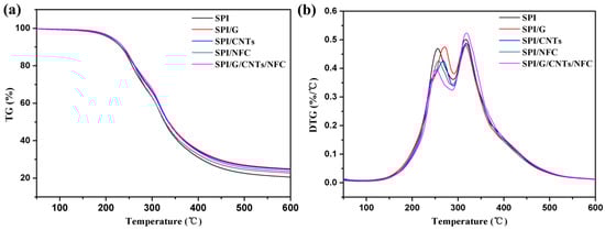 (a) Thermogravimetric analysis (TGA) and (b) differential thermogravimetry (DTG) curves of SPI, SPI/G, SPI/CNT, SPI/NFC, and SPI/G/CNT/NFC series films.