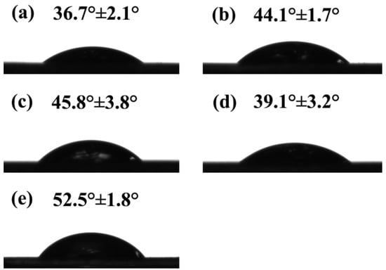 WCA values of (a) SPI, (b) SPI/G, (c) SPI/CNT, (d) SPI/NFC, and (e) SPI/G/CNT/NFC series films.