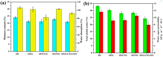 The water resistance of the SPI-based nanocomposite film was determined by testing the moisture content (MC), total soluble matter (TSM), and water absorption (WA). As shown in Figure 10, the neat SPI film generally possessed poor water-resistance properties. After the modification of the graphene and CNTs, the MC and WA values of the films simultaneously decreased, which demonstrated that the SPI/G and SPI/CNT films had higher resistance to water absorption than the unmodified film. Compared with the SPI film, the TSM and WA of the SPI/G/CNT/NFC film obviously decreased to 24.28% (26.78% decrease) and 92.42% (12.73% decease), respectively. These results suggested that there could exist synergetic effects among the graphene, CNTs, and NFC. The combination of these could promote the formation of hydrogen bonds and the cross-linking network in the composite, and effectively prevent the swelling of the polymeric matrix in wet conditions [46].