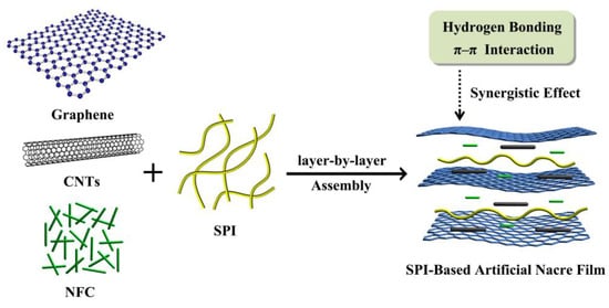 In the present study, we fabricated nacre-like SPI-based nanocomposites with the assembly of 2D graphene and 1D CNTs and NFC via a layer-by-layer self-assembly process. The combination of covalent bonds, hydrogen bonding, and π–π stacking in the mixture exhibited a synergistic strengthening effect on the mechanical properties and water resistence of the SPI-based nanocomposites. The TS of the SPI/G/CNT/NFC film increased from 3.56 MPa to 6.37 MPa, and the TSM and WVP decreased by 26.78% and 31.76%, respectively, compared with the unmodified one. In addition, the cross-linking network of SPI/G/CNT/NFC and multiple interface interactions between the nanophase and SPI matrix endowed the composite films with better thermal stability than the control. The biomimetic strategy proposed in this work represented a promising approach for preparing high-performance composites.