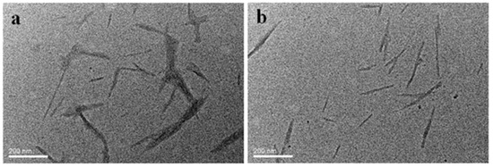 In order to characterize the morphology and dispersion state of the un-modified NCC and cationically modified NCC, the samples were imaged using a transmission electron microscope (TEM) (see Figure 1). For the unmodified NCC, some localized aggregation was observed (Figure 1a). Furthermore, the nanocrystals tended to self-assemble into a bundle of several nanocrystals instead of remaining as individual nanocrystals, which was mainly due to the relatively low surface charge density and rod-like shape of NCC [,]. The low surface charge density of NCC resulted in weak electrostatic repulsions between the nanocrystal particles. In contrast, the cationic surface functionalization of NCC generally improved the dispersion state (Figure 1b). Some rod-like individual nanocrystals were evident. These results are in agreement with the findings reported in the previous work where CNCC was prepared via a wet process [].