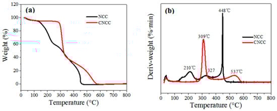 The thermal stability of NCC and CNCC was investigated by TGA, and the results are shown in Figure 2a,b. The TGA curves (Figure 2a) show that the onset temperature of thermal decomposition of CNCC was obviously higher than that of NCC, which directly indicates that the obtained CNCC had better thermal stability than NCC. This may be due to the sulfate groups introduced onto the NCC chains which catalyzed the thermal degradation of cellulose [,].