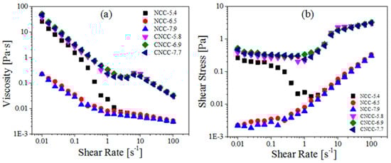 (a) Viscosity and (b) Shear stress as a function of shear rate for NCC and CNCC suspensions at various pH.