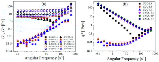 Figure 4b shows the complex viscosity (η*) of NCC and CNCC suspensions over the whole angular frequency range (ω = 0.1–500 rad·s−1). For NCC suspensions, η* decreased in the low-frequency range but did not change at higher frequencies with the increase in pH. In the case of CNCC suspensions, increasing the pH still did not change η*. The shear thinning in η* characterizes the transition from elastic to viscous behavior []. However, at a higher angular frequency, a transition occurred, and in the second region, η* increased with the increasing frequency after a critical frequency. This is an indication of structure formation among the nanocrystals due to strong hydrogen or ionic bonding interactions [].