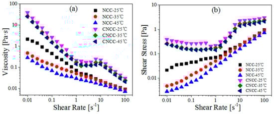 (a) Viscosity and (b) Shear stress as a function of shear rate for NCC and CNCC suspensions at different temperatures (25, 35, 45 °C).