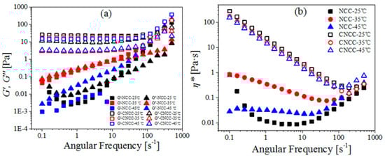 (a) Storage modulus (G′), loss modulus (G″), and (b) Complex viscosity (η*) as a function of angular frequency for the NCC and CNCC suspensions at different temperatures (25, 35, 45 °C).