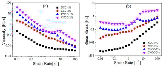 (a) Viscosity and (b) Shear stress as a function of shear rate for NCC and CNCC suspensions at different concentrations (1, 2 wt %).