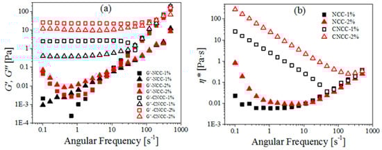(a) G’, G″, and (b) η* as a function of angular frequency for NCC and CNCC suspensions at different concentrations (1, 2 wt %).