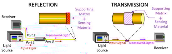 Schematic representation of two different architectures used for optical fiber sensors such as reflection mode (left) and transmission mode (right). Reprinted with permission of [16].