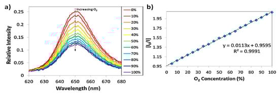 Figure 3 presents the sensor response to different oxygen concentrations from 0% to 100% in 10% steps. The experimental results indicate that the peak emission intensity is reduced as the oxygen concentration is gradually increased. The sensing mechanism relies on oxygen quenching. In other words, the luminescence is affected by molecular oxygen because there is a reaction with the excited state of the fluorophore, limiting the luminescence emission, so that the higher oxygen concentration, the lower emission is collected. In Figure 3a it can be clearly observed that when no oxygen is present (0%), the emission peak relative intensity is close to 0.25, whereas for a 100% of concentration, the emission peak falls to a value of 0.1182. It can be seen in the Stern-Volmer plot of Figure 3b that there is a linear relationship between the relative intensity of the emission and the resultant gas concentration [27].