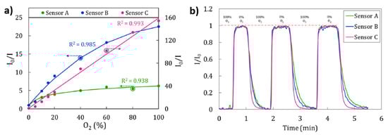 (a) Calibration curves of Sensors A (PDDA), B (PEI) and C (PAH). To make easier the comparison between the curves shapes, calibration curves of Sensors A and B are adjusted on the left axis, whereas that of Sensor C is adjusted on the right axis; (b) Response of the Sensors to dynamic variations of oxygen concentrations from 0% to 100% repeatedly in 3 cycles. Reprinted with permission from Ref. [28].