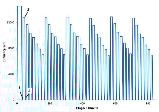 Steady-state fluorescence measurements over time (excitation 380 nm and emission 500 nm) of the dry optical fiber with six layers, followed by three cycles of Hg(II) aqueous solutions with in the following concentrations: 0, 0.01, 0.05, 0.1, 0.799, 1.99 and 2.69 μM. (1) The fiber was immersed in water, (2) removed from water, and (3) immersed in Hg(II) 0.01 μM. Reprinted with permission from Ref. [36].