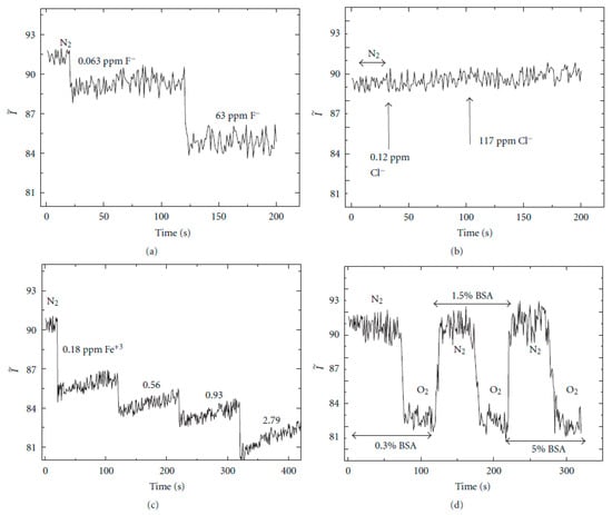Potential interference of the DO measurement: sensor response to the presence of different species such as F− (a), Cl− (b), Fe3+ (c) and bovine serum albumin (BSA) (d). Reprinted with permission from Ref. [44].