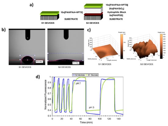 Another of the most interesting applications related to the use of HPTS is pH sensing [50,51,52,53]. An example of this can be found in [50] where the preparation of a fiber-optic sensing probe by using sol-gel process is presented and its employment for fluorescence detection of pH in small volumes of biosamples (droplets of plant xylen exudate). In work [52] several parameters are evaluated in order to minimize the photobleaching of the HPTS when it is encapsulated by a polymeric polyelectrolyte multilayer structure by using the Layer-by-Layer process. More specifically, three key fabrication parameters such as the composition of the fabrication atmosphere, a thermal curing process and the addition of an antifading agent to the polymeric matrix make possible an enhancement of the response time as well as a reduction of photobleaching effect. A similar work for obtaining an enhancement in the response time of pH sensing films can be found in [53] by means of using hydrophilic nanostructured coatings. In this work, two different LbL structures have been fabricated. The first one is just the “classical” polymeric sensitive coating with HPTS (named as S1) and the second one is composed of a high hydrophilic coating made of polymer and silica nanoparticles (SiNP) deposited prior to the sensitive one (names as S2). The experimental results obtained by water contact angle measurements of the samples corroborate this hydrophilic behavior which is associated to the higher roughness surface of the sample S2 introduced by the SiNP. This hydrophilic value added to the sensitive nanocoatings makes possible a better diffusion of water molecules and ions through the multilayer structure. Due to this, the response time of S2 sensor to pH changes between pH 3 to 7 is considerably lower than S1 sensors with an improvement of 5 times faster, from 15 min of the non-optimized device to 3 min. A summary of these experimental results is presented in Figure 8.