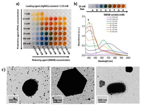 (a) Photograph of the multicolor silver map obtained as a function of variable protective agent (PAA from 1 to 250 mM) and reducing agent (DMAB from 0.033 to 6.66 mM), respectively; (b) UV-Vis spectra of the silver solutions prepared with variable DMAB concentration at a constant PAA concentration of 25 mM (fifth line of the multicolor silver map); (c) TEM images corresponding to AgNPs with spherical shape (orange color), hexagonal shape (green color) and rod shape (violet color), respectively. Reprinted with permission of [59,60].