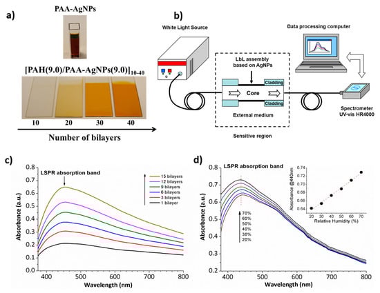 One of the main benefits of using a polymeric protective agent such as Poly(acrylic acid, sodium salt) (PAA) for the synthesis of metallic nanoparticles is that this weak polyelectrolyte can be used to fabricate a multilayer buildup by using the LbL nano-assembly [61,62]. Once a good control over the synthesis of multicolor nanoparticles and the distribution of them in the resultant LbL films is obtained, the design of optical fiber sensors to detect physical parameters (refractive index, relative humidity) [63,64,65,66], chemical parameters (pH) [67,68] or biomedical parameters (human breathing) [69] is possible. A clear example can be found in Figure 10 where colored thin films based on the incorporation of metallic AgNPs with an orange coloration by using the LbL technique is presented (Figure 10a). In Figure 10b, the experimental setup used for the fabrication of polymeric sensitive LbL coatings onto an optical fiber core and for the characterization of the LSPR absorption band in the visible region inherent to the metallic nanoparticles. Figure 10c shows the UV-Vis spectra when the number of bilayers added in the final coating onto optical fiber core are increased from 1 to 15 bilayers. The spectra show a direct relation between the number of bilayers added (a higher thickness coating) and the increase of the absorbance value related to the LSPR absorption band at 440 nm. This is indicative that the amount of AgNPs incorporated into the LbL films directly increases with the thickness coating when the number of bilayers is gradually increased. In addition, the wavelength position of the LSPR band is maintained at 440 nm during the gradual incorporation of AgNPs, indicating a complete incorporation of spherical nanoparticles without any aggregation of them. Finally, Figure 10d shows the Relative Humidity (RH) response of the LSPR-optical fiber sensor where a change in intensity of the LSPR absorption band from 20% to 70% RH with a linear response (inset) is observed.