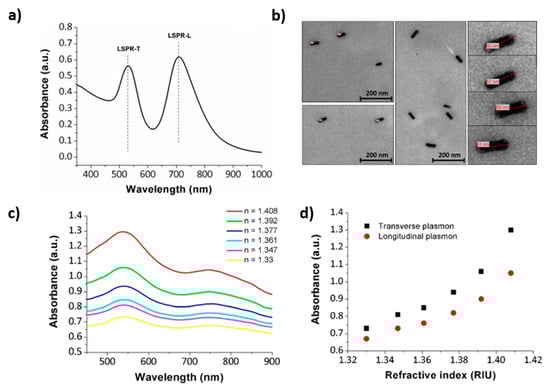 (a) UV-Vis absorption spectrum of the GNRs@PSS solution with two distinct absorption peaks at 530 nm (LSPR-T) and 710 nm (LSPR-L); (b) TEM micrographs and some zoom details of the synthesized GNRs; (c) Spectral response of the LSPR bands when the sensitive region is immersed in different Refractive Index (RI) solutions; (d) Growth in intensity of the LSPR-T and LSPR-L maxima to external RI variations. Reprinted with permission of [72].