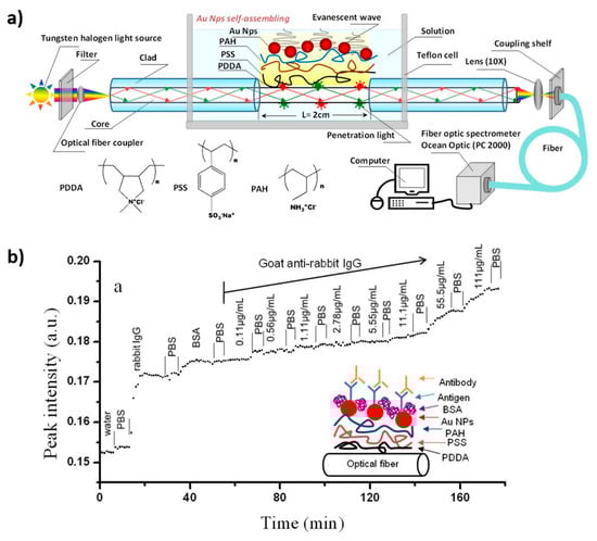 (a) Schematic representation of the experimental setup of the LSPR optical fiber sensor by using a trilayer polyelectrolyte structure which has been used to assemble the gold nanoparticles; (b) LSPR biosensing at different concentrations of goat anti-rabbit IgG from 0.11 to 100 μg/mL. Reprinted with permission from Ref. [74].