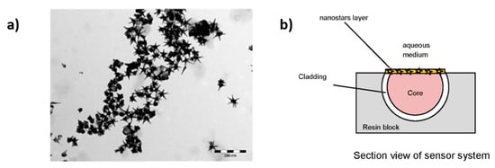 (a) TEM image of the five-branched gold nanostars (GNS); (b) Optical sensor system based on LSPR in POF. Reprinted with permission from Ref. [81].