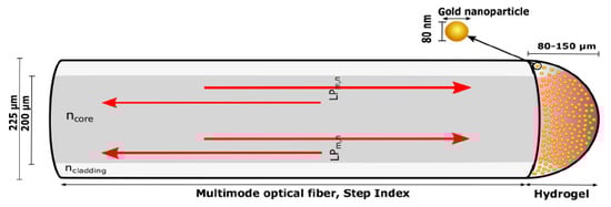 Illustration of the multimode optical fiber with hydrogel containing gold nanoparticles immobilized on a fiber end. Visible light is guided in the fiber core with the numerical aperture colored with red in the hydrogel. Reprinted with permission from Ref. [89].