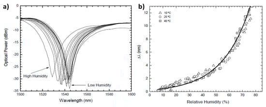 (a) Experimental results for different relative humidity levels; (b) Relative resonance wavelength shift with relative humidity levels for different temperature values. Reprinted with permission from Ref. [92].