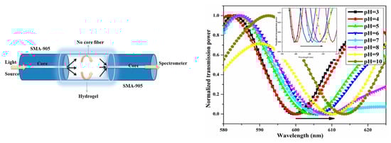 Hydrogel-based pH optical fiber interferometric sensor. (Left) Schematic representation of the optical fiber device. The NCF segment acts as interferometric cavity. (Right) Optical spectral response of the sensor when immersed into different pH solutions. The minima wavelength shows a direct relationship with the pH of the solution. Reprinted with permission from Ref. [101].