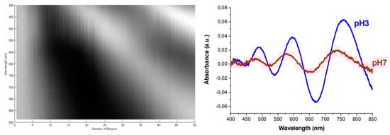 Nevertheless, it is not just classic hydrogels that are suitable for this kind of application. Layer-by-Layer (LbL) polymeric assemblies can be used for humidity and pH sensing. Such LbL coatings offer additional advantages since it is possible to keep a very good control of the composition and morphological characteristics of the films independently from the geometry of the substrate. The good control of the LbL sensitive films can be used to create ultra-thin interferometric cavities directly at the end face of perpendicularly cleaved optical fibers [105]. Figure 18 shows the optical response of the sensor as the (PAH/PAA) LbL multilayer is sequentially built up to 50 bilayers. The high quality and the low thickness of the (PAH/PAA) coatings induces the formation of a Fabry-Perot cavity that shows a classical interference pattern even with low-coherence light sources such as a halogen lamp. Since PAH and PAA are weak polyelectrolytes, the morphological properties of the polymeric chains are strongly pH-dependent, and these pH changes may induce significant changes in the thickness, roughness and effective refractive index of the LbL thin-film [62]. The interferometric characteristic of such sensors offers additional advantages respect to the previous evanescent approaches, as far as the interferometric responses are wavelength-based signals, which means that the measurement will be robust against intensity fluctuations of the light.