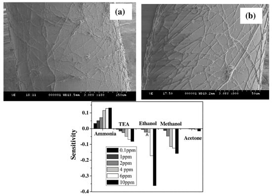 Electrospun nanofibers PPy/PEO. (Top) (a,b) SEM images of the electrospun fibers over the core of the 600 µm optical fiber. (Bottom) Sensitivity of PPy/PEO coated optical fiber against ammonia, triethylamine, ethanol, methanol, and acetone vapors at different concentrations. Reprinted with permission from Ref. [109].