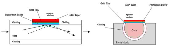Plastic optical fiber SPR-based TNT sensor. (Left) Longitudinal-sectional diagram of the sensor. It depicted the gold thin film for the SPR generation, and the MIP external TNT sensitive layer. (Right) Cross-section view of the sensor showing the side-polished sensitive region. Reprinted with permission from Ref. [122].