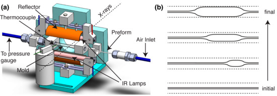 (a) A 3D diagram of the tube expansion instrument defines the positions of the IR lamps and reflectors above and below the mold, the thermocouple on the mold surface, the connection to the pressure transducer and the air inlet, and illustrates how the preform is inserted into the mold and oriented relative to the path of the X-rays. (b) Schematic diagram of the inflation process, which progresses from the side of tube attached to the air inlet to the opposite end.