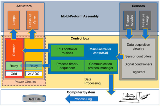 Block diagram describing the interface between the sensors, actuators, control unit and the data acquisition systems.