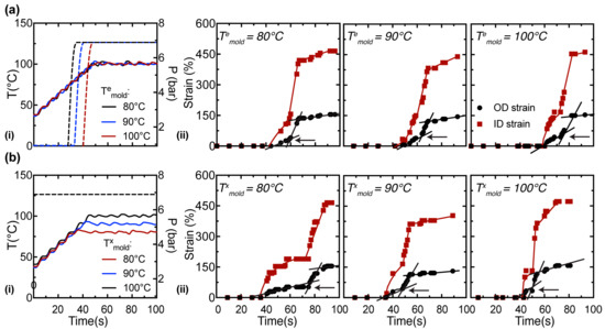 Video recordings are used to estimate the transient outer diameter (OD) of the preform, which changes in a complex manner with time (Figure 4). While some elongation may occur along the axial direction, it is much less than the hoop elongation. Here, we make the approximation of neglecting the axial elongation and analyze the outer diameter to estimate the strain at the outer surface. When the internal pressure is abruptly imposed at a prescribed temperature (Figure 4a, i), the initial deformation progresses at a similar rate (~0.025 s−1 at the OD, Figure 4a, ii) till an inflection point at an OD strain of 40–50% (marked by black arrows in Figure 4a, ii). After the inflection, the strain rate increases dramatically, to approximately 0.07 s−1 (Figure 4a, ii), until the deformation rate slows down when the OD strain approaches ~150%. The rates of deformation are similar in the first mode of operation (Temold = 80, 90 and 100 °C) as the mold temperature has reached a steady state (100 °C) during inflation.