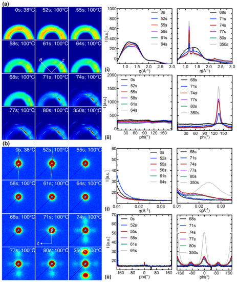 Comparison between simultaneously acquired WAXS and SAXS patterns indicate that WAXS is more sensitive than SAXS to the onset of expansion (SAXS features appear a few seconds after the occurrence of (110)/(200) peaks in WAXS, compare Figure 5 and Figure 6a,b) [29]. The SAXS intensity continues to increase post expansion and adopts a bimodal distribution with peaks located along the meridian (parallel to the θ-direction) and the equator (parallel to the z-direction) of the patterns (see Figure 5 and Figure 6b, 350 s). The SAXS peaks along the meridian are more than twice as intense as the equatorial peaks, suggesting a dominant oriented microstructure along the θ-direction of the tube. The SAXS intensity decreases during the cooling step in accord with densification of the amorphous interlamellar space (t > 350 s, Figures S15–S20). Interestingly, both the equatorial and the meridional peaks shift towards higher-q during annealing, indicating a steady decrease in the long period (note the shift in peak intensity towards higher-q is more apparent in Figure 5 and Figure 6b, i; we return to this in the Discussion). The greater intensity of SAXS peaks in Txmold = 100 °C relative to Temold = 100 °C (>15%, compare Figure 5 and Figure 6a,b, 350 s and Figure 8a,b, left) suggests that the former introduces a greater population of regular spaced lamellar stacks (>25 nm, Figure 8a,b, right) along the θ-direction of the expanded tube.