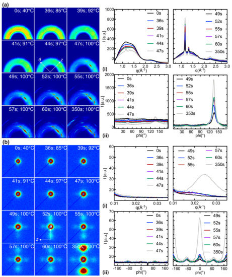 In situ (a) WAXS and (b) SAXS data acquired on a PLLA preform stretched at Temold = 100 °C. The diffraction patterns capture the transient heating and annealing steps (t < 350 s, Tamold = 100 °C) and correspond to the temperature and strain profiles in Figure 3 and Figure 4a. Diffraction patterns acquired during the cooling step (t > 350 s) can be found in Figure S17. The WAXS and SAXS data are presented as: 2D patterns; (a,b, i) azimuthally averaged intensity I(q); and (a,b, ii) radially averaged intensity I(φ).