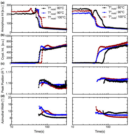 Quantitative characteristics of 1D WAXS profiles for expansion performed at: (left) Temold = 80, 90 and 100 °C; and (right) Txmold = 80, 90 and 100 °C. The variation in: (a) amorphous content; (b) crystallinity; (c) peak position of the (110)/(200) peaks; and (d) full width at half maximum of the (110)/(200) peaks is presented during the heating and the annealing steps (t ≤ 350 s); quantitative analysis for the cooling step is presented in the Supplementary Materials (Figure S21).