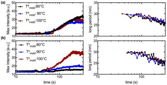 Quantitative characteristics of 1D SAXS profiles for expansion performed at: (a) Temold = 80, 90 and 100 °C; and (b) Txmold = 80, 90 and 100 °C. The variation in: (a,b, left) the maximum intensity of the meridional SAXS peaks; and (a,b, right) the interlamellar spacing is presented during the heating and the annealing steps (t ≤ 350 s); quantitative analysis for the cooling step is presented in the Supplementary Materials (Figure S22).