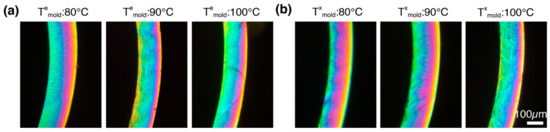 Expanded tubes stretched at: (a) Temold = 80, 90 and 100 °C (Figure 3 and Figure 4a); and (b) Txmold = 80, 90 and 100 °C were extracted from the instrument and microtomed parallel to the (r,θ) plane to yield consecutive 50 µm thick circular cross sections. The 50 µm sections were sandwiched between glass slides and imaged through linear crossed polarizers. Note that the sequence of Michel Levy colors from blue green to purple to pink to orange to yellow unambiguously shows that the retardance decreases from ID to OD.