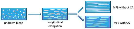 On the other hand, it is also known that the MFC concept relies on the incompatibility between the matrix and dispersed phase, and that the final mechanical properties depend on the aspect ratio of the reinforcement and the interfacial adhesion between the matrix and reinforcement [4]. Various authors [4,15] have proposed that combining these two approaches, the MFC concept and compatibilization, could improve the properties of the final composites. According to Fakirov et al. [4], MFCs without compatibilizer can reach fibril lengths of up to 200 µm because the coalescence will take place during blending and drawing. In cases with a compatibilizer, Friedrich et al. [16] found a decrease in the tensile modulus and strength for the PP/PET in situ compatibilized microfibrillar blends. They attributed this reduction to the shorter microfibrils caused by the use of a compatibilizer, which covers the PET particles during melt blending and prevents their coalescence during drawing. This change in morphology can be seen in Figure 1. Fakirov et al. [15] reported in one of their studies that a compatibilizer affects the length of the fibrils depending on in which step of the processing sequence it is added. They have therefore suggested adding a compatibilizer to the drawn blend, in the final processing step, in injection or compression moulding. At this stage, the compatibilizer should facilitate distribution of the fibrils, improve the interfacial adhesion between matrix and fibrils, and enhance mechanical properties without reducing the aspect ratio of the fibrils. However, there are no experimental results to support this theory. To fill this gap, the present study investigates the effect of adding a compatibilizer during both extrusion and injection moulding. To this end, we have selected both a non-functionalized rubber and a functional compatibilizer, as a difference in migration to the interface and reactivity is expected.