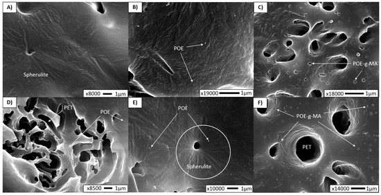 Besides POE-g-MA at the interface, non-reacted compatibilizer particles were found in the PP matrix as well (Figure 4C,F). As there is always some amount of the compatibilizer that will not react with the PET during melt blending, this amount is dispersed through the matrix and between the microfibrils. These isolated POE-g-MA particles may also act as nucleation sites for PP [28], which explains why the nucleating effect is the most pronounced and the lowest PP crystal size is achieved. Additionally, in POEIM, a spherulitic orientation is observed around the fibril hole (Figure 4E), which confirms the nucleating effect of the PET.