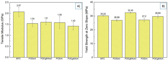 Tensile properties of MFC composites (A) Tensile modulus; (B) Yield strength at zero slope.