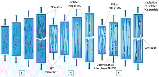 G’Sell et al. [37] explained that several mechanisms could contribute to the general deformation of an MFC sample including elastomers under tension: interface decohesion, cavitation at the PP/PET interface, and the cavitation in isolated POE-g-MA particles. These are summarized in the fracture model for the MFCs made with POEEXT, POEIM or POE-g-MAIM, as shown in Figure 6C.