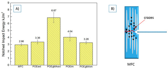Comparing the toughness of the composites (Figure 7A), we observed that the POE-g-MAEXT gave the highest value for the impact energy. This could be explained by the fact that there is high interfacial adhesion between the fibrils and matrix in POE-g-MAEXT, as polar carboxyl groups of MA grafted onto POE backbone improve the adhesion with the PET phase. In addition to the interfacial adhesion between the oriented PET fibrils and the PP matrix, as has been mentioned earlier, both the size and amount of PP crystallites play an important role in determining impact strength. The PP spherulites become more imperfect and smaller due to the presence of PET fibrils, which may increase toughness [5,18]. As mentioned earlier, the spherulite size in POE-g-MAEXT was the lowest, which obviously contributed to an increase in toughness.