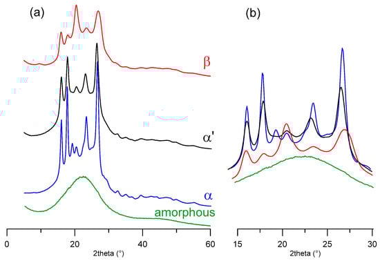 X-ray diffraction (XRD) patterns of PEF: (a) from top to bottom: β-, α’-, α-phase and amorphous sample; (b) superposition of the patterns in the range 15°–30°.